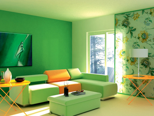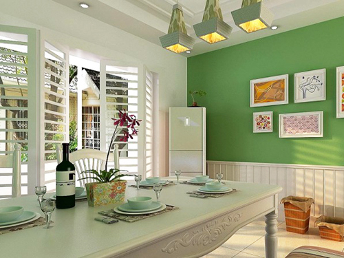 整個客廳內(nèi)都以綠色為基調(diào),橙黃色的桌子和沙發(fā)不僅不會讓人覺得格格不入,反而成為客廳內(nèi)的一大亮點。濃濃的綠意充斥著整個室內(nèi),柔柔的陽光從窗外射入,照射著淡綠色、橙黃色的沙發(fā),帶來絲絲春意,簡約而不單調(diào)。