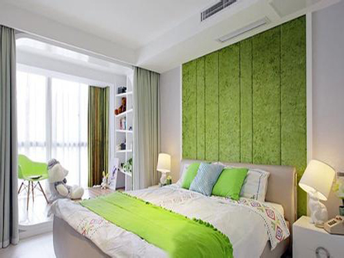 床頭上綠色的軟包裝墻壁跳出了白色的背景墻,顯得別具一格,優(yōu)雅的燈飾,時尚簡約的坐凳,綠色的抱枕,樸素的窗簾,共同演繹著春天的風(fēng)情。