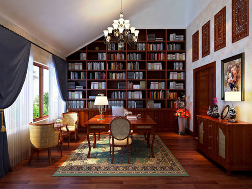 書房:書房是房主人用來辦公學習的地方,中式田園風格的書房自然不能少了清幽淡雅的感覺。對于中式田園風格書房的設(shè)計,田園的氣息要從細微之處體現(xiàn)整體上則要以平間簡潔的元素為主。綠色是大自然的主打顏色,啞綠作為書房的主色調(diào),可使得這個書房即雅致有很有穩(wěn)重感,與淡綠色的窗簾相呼應(yīng),甚是和諧。當然,深木色的主題色調(diào)也是很適用于中式田園風格書房的色調(diào),沒有雕工細膩繁雜的雕花,少了那份柔美,卻多了幾分硬朗,與書房氣氛相得益彰。