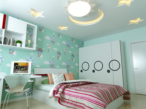 來(lái)看看這款公主房的設(shè)計(jì),整體給人以素雅簡(jiǎn)單的視覺(jué)感受,造型簡(jiǎn)潔的家具,淺色系的裝修主色調(diào),即使床頭背景鋪貼有帶圖壁紙,也沒(méi)有不和諧的感覺(jué)。天花板上的設(shè)計(jì)是最獨(dú)具匠心的。一改往日的清一色天花只有一個(gè)吊燈的設(shè)計(jì),將天花板整體設(shè)計(jì)為天空的造型,中心為太陽(yáng)形狀的吸頂燈,旁邊還有月亮和星星造型的裝飾,可在內(nèi)部放入LED燈帶,晚上睡覺(jué)前關(guān)閉臥室的燈,點(diǎn)亮它,會(huì)有好似夜晚的星空就在家中一樣的感覺(jué)。