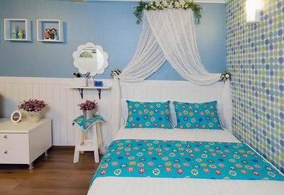 其實(shí),公主房的色調(diào)除了粉色系之外的顏色,可是很好看的。這款公主房的造型設(shè)計(jì),沒(méi)有使用粉色系作為整間房間的主要色系,而是選擇青色系應(yīng)用到房間的設(shè)計(jì)中,淡藍(lán)色的床頭背景好似藍(lán)天,藍(lán)色小碎花圖案的床品以及馬賽克風(fēng)格的前面設(shè)計(jì),白色柵欄式的裝飾及純色的家具,素色紗質(zhì)的床幔垂掛于花型橫桿上,向日葵造型的鏡子甚是可愛(ài),淡紫色的盆栽小植物,柚木色的地板,將這所有的元素的組合在一起營(yíng)造出的是田園公主的起居室,房間內(nèi)彌漫著濃濃的鄉(xiāng)村田園風(fēng)情,倍感悠閑自在,輕松舒適。