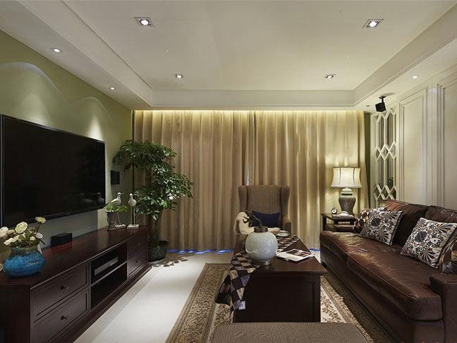 綠色墻壁紙鋪貼設(shè)計的電視背景墻,明亮柔和的射燈燈光點綴,清新自然;深色實木電視柜搭配,造型方正,給人莊重大氣之感。石膏板吊頂,一改以往一個主燈為客廳照明的方式,改用多個小射燈裝飾并為客廳晚間提供光源,實際簡潔明快。石膏裝飾工藝設(shè)計的電視背景墻,石膏相框裝飾,干凈素雅。棕色皮質(zhì)簡約沙發(fā),深色花紋靠枕裝飾,淺棕色布藝沙發(fā)椅及方形坐墩搭配,盡顯尊貴高雅。淺色地板磚鋪地,精美圖案地毯過渡,方形實木茶幾,造型簡約,線條流暢,做工精細(xì),菱形格子紋方形桌旗裝飾。整個家居客廳設(shè)計一深淺對比的設(shè)計手法,營造出了層次分明、明亮輕快、簡潔舒適且沉穩(wěn)莊重的現(xiàn)代簡約風(fēng)格家居。